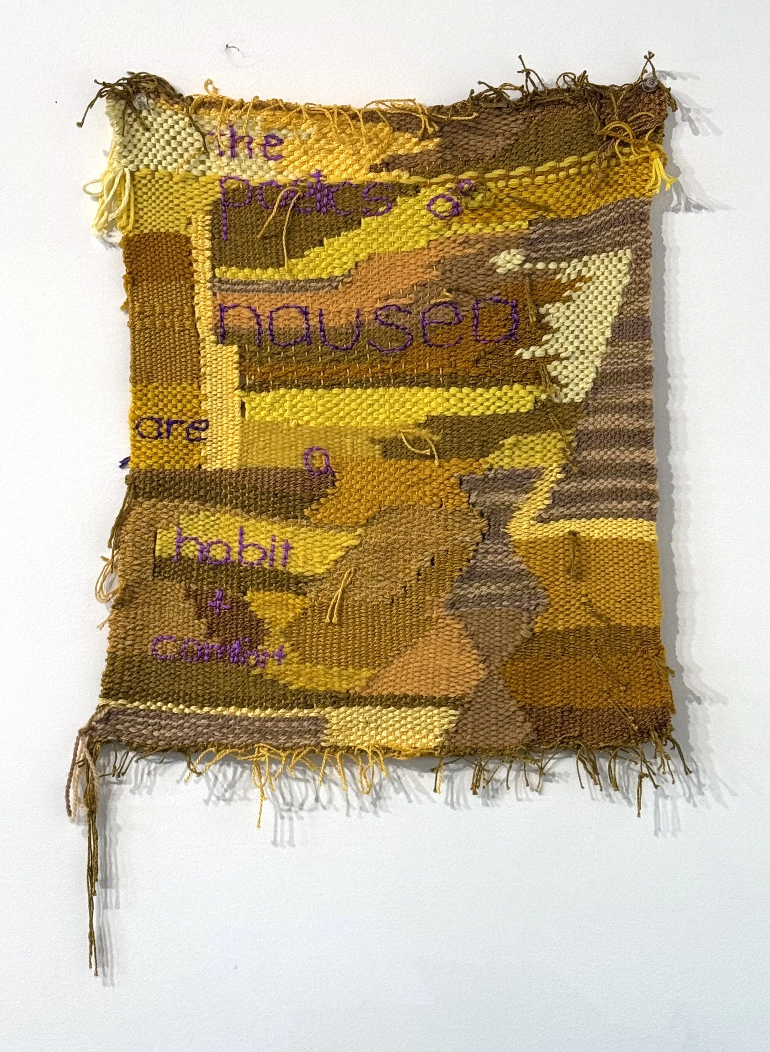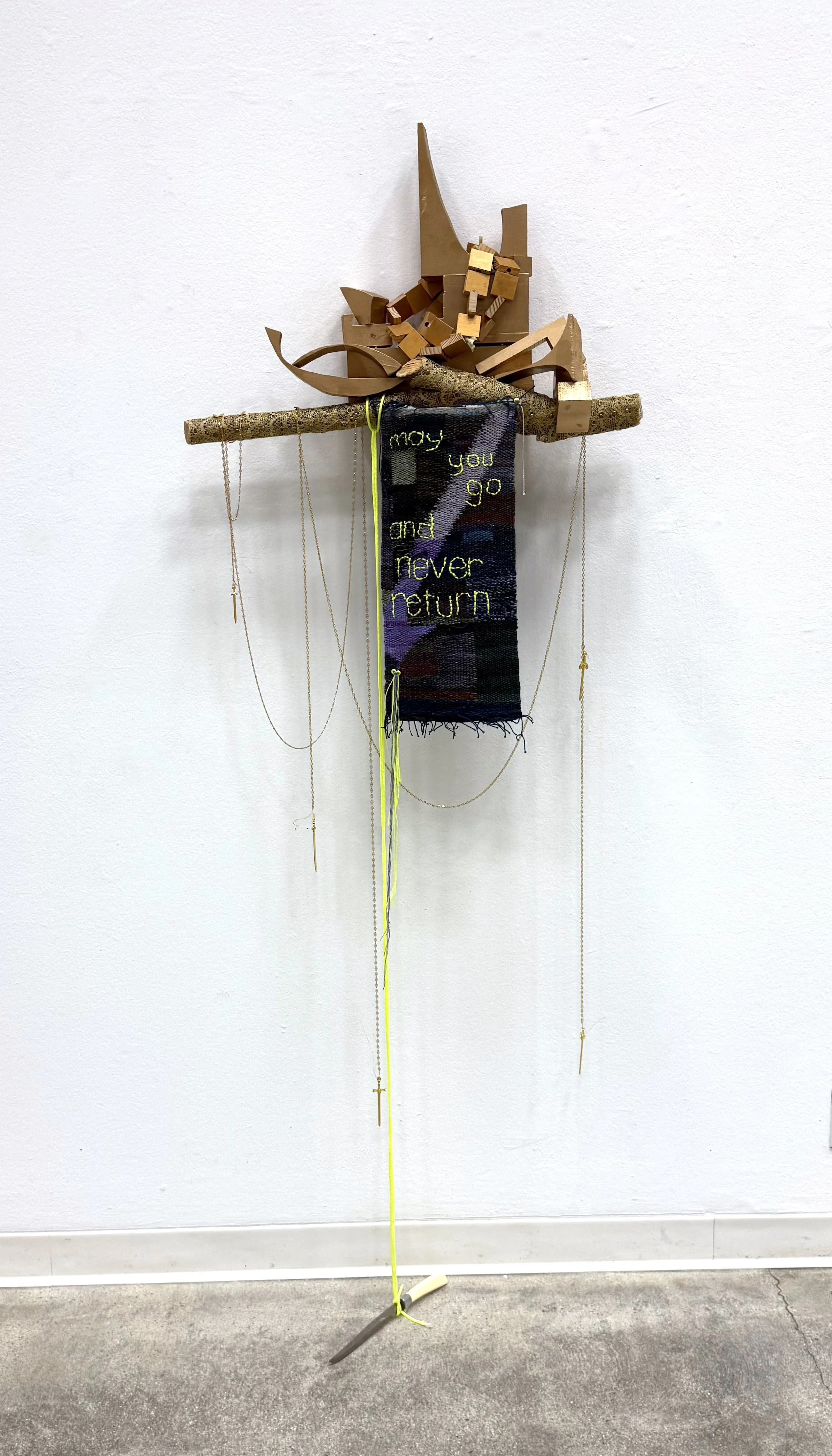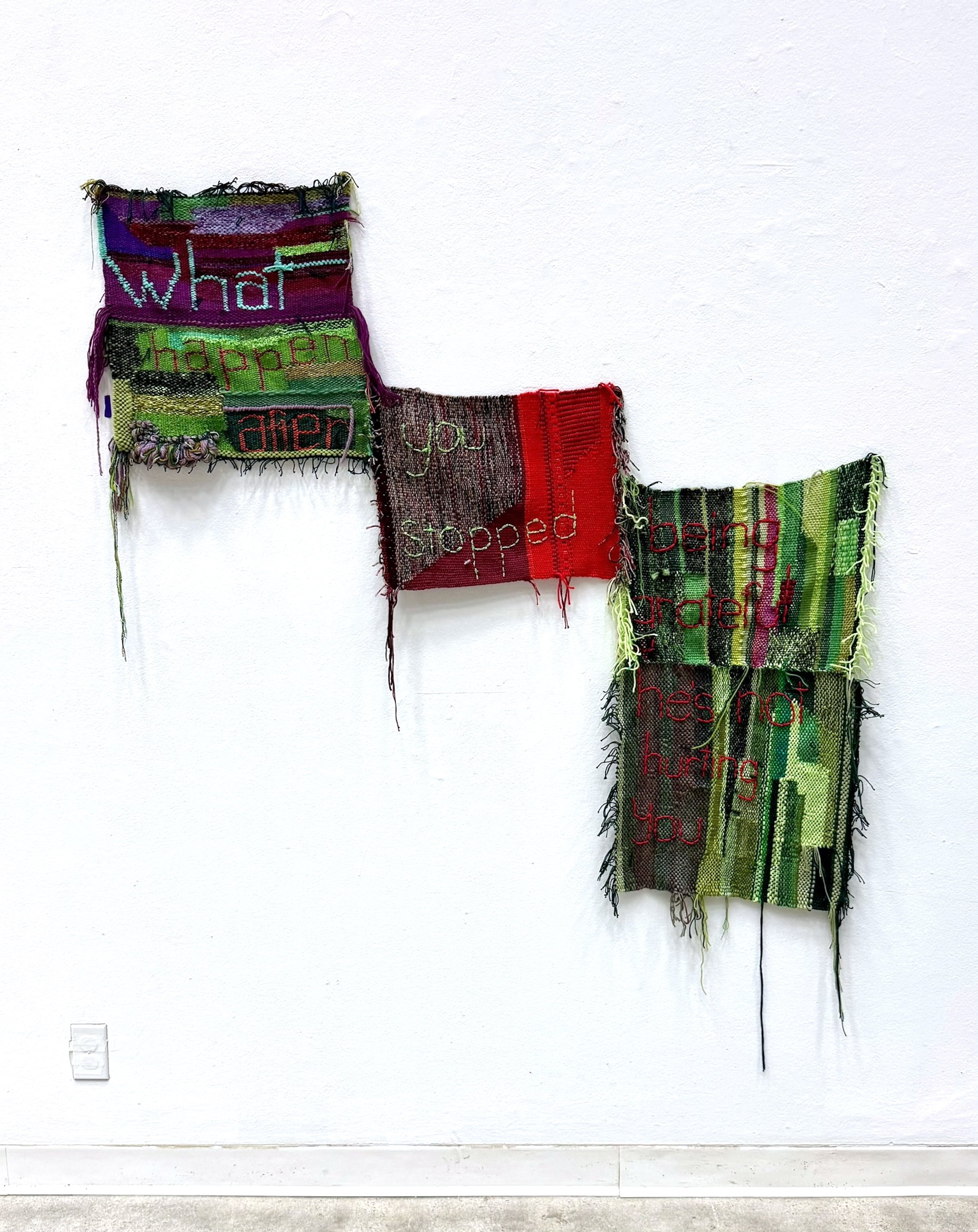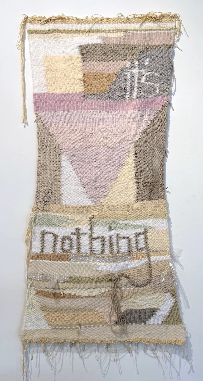 New Work It’s Nothing, 2026, cotton, wool, acrylic and dray cleaning bag plastic, 41” x 20.5” What Happen (after you stopped being grateful he’s not hurting you), 2025, cotton, wool and acrylic, 56” x 68” The Poetics of Nausea (are a habit and comfort), 2025, cotton, wool, acrylic and silk Analog AF, 2025, cotton, acrylic, dry cleaning bag plastic and wool, 19" x 22” May You Go and Never Return, 2025, cotton, wool, acrylic, wood, kitchen knife, gold chains and pendants, 28.5” x 15.5” x 77”