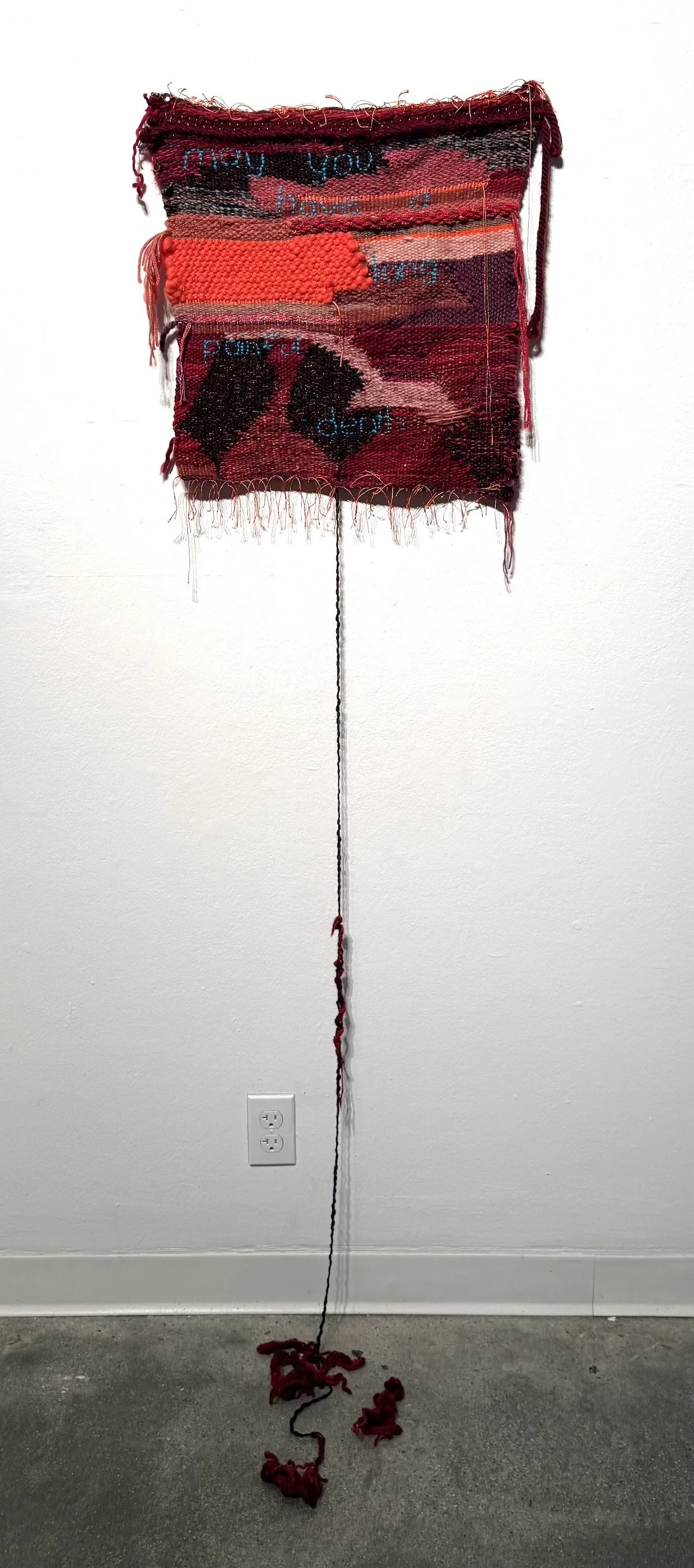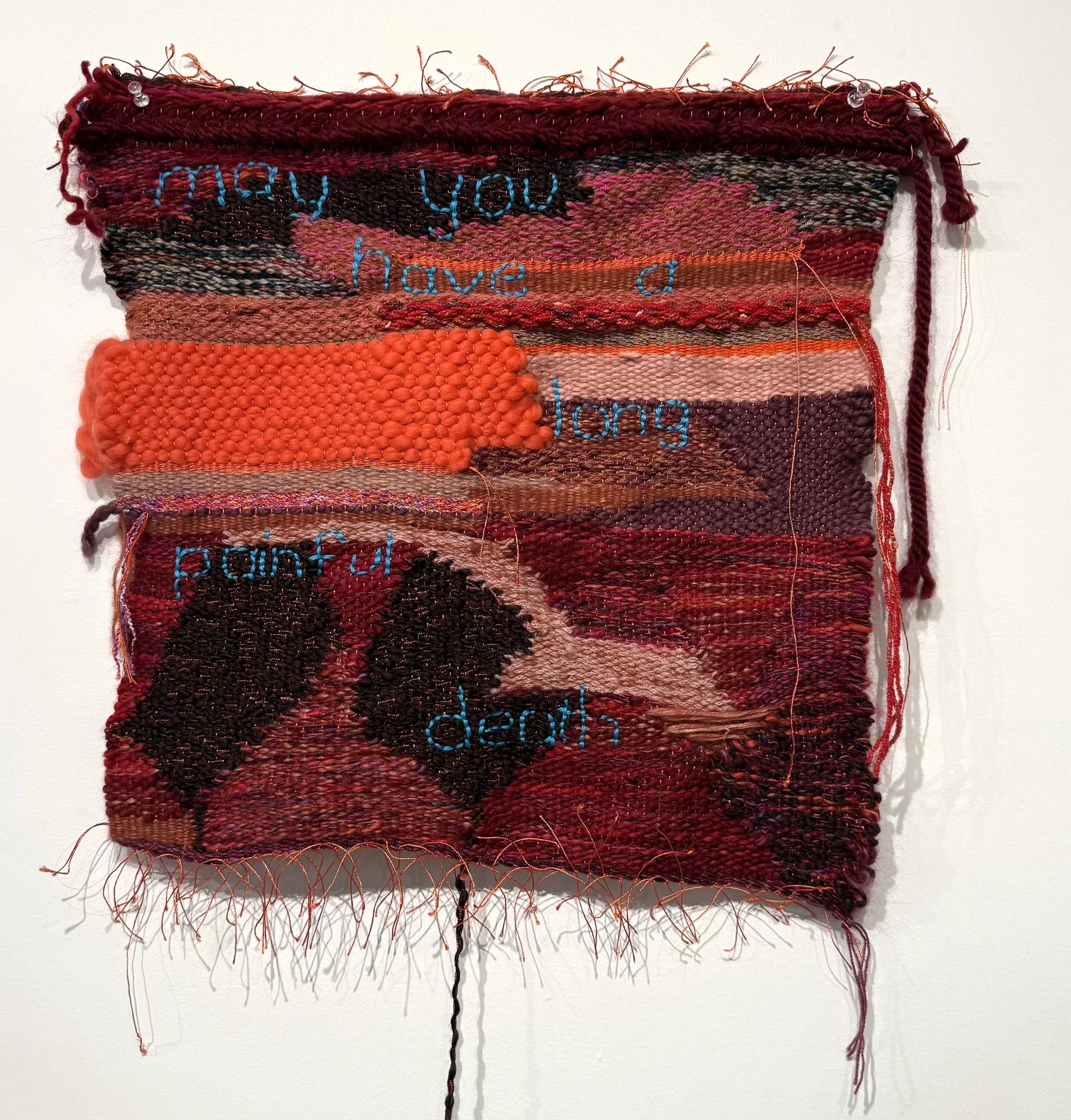 May You Have a Long Painful Death, 2025, silk, wool, acrylic, and cotton, 65” x 20.5”