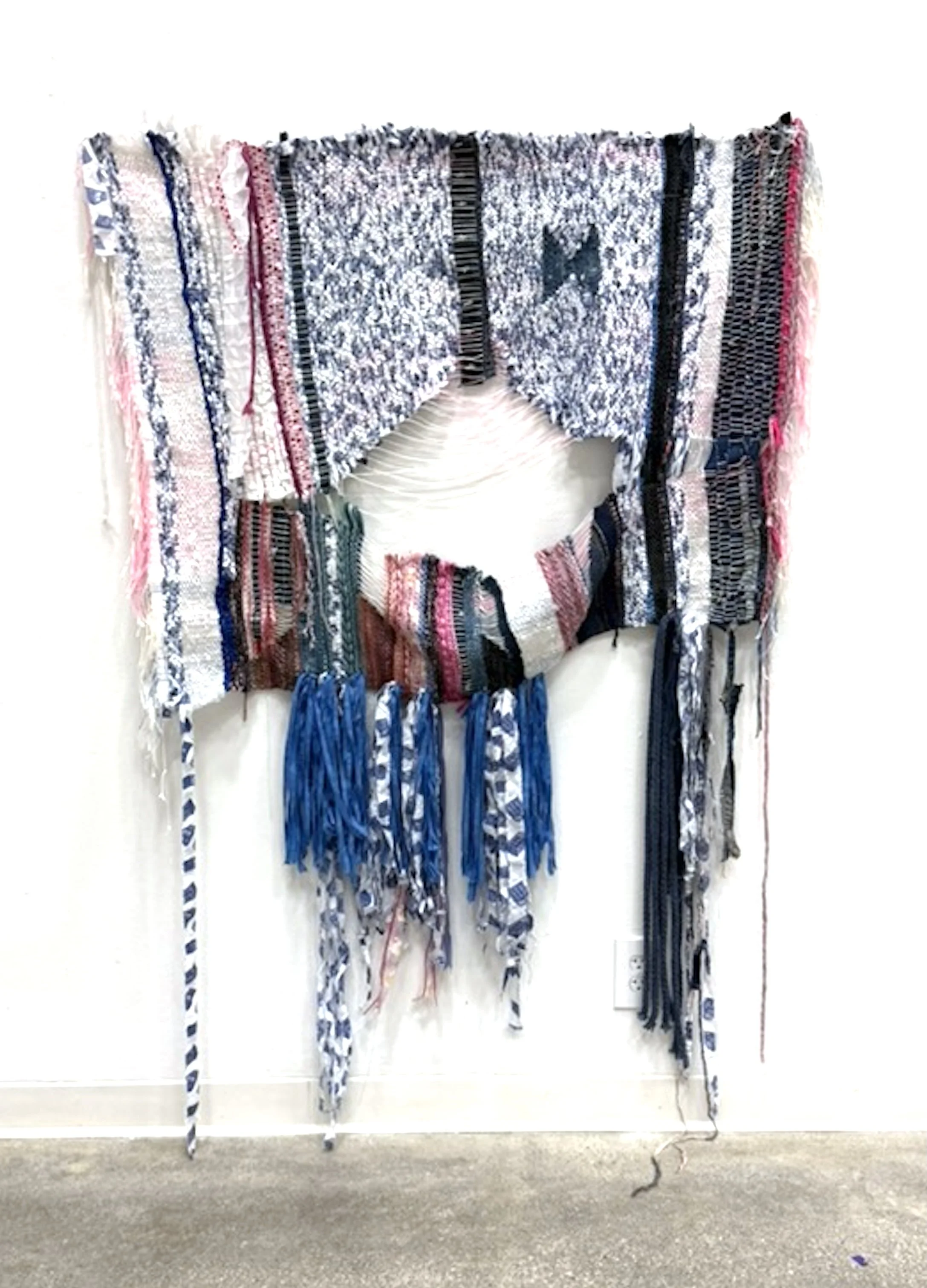 Metis, 2024, plastic, nylon, bed sheets, ribbons, denim, textile waste and acrylic ink, 77” x 48”